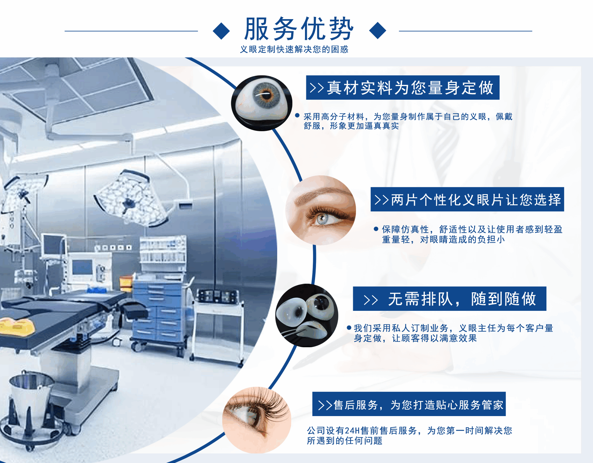 正目醫(yī)療科技有限公司致力于為用戶提供假眼,在哪里可以定制義眼,義眼哪家好,假眼價格,義眼價格,義眼費用,義眼公司,是集義眼定制、保養(yǎng)、咨詢?yōu)橐惑w的綜合性義眼定制企業(yè)。 獨創(chuàng)的義眼工藝結(jié)構(gòu),根據(jù)仿生物學原理,采用進口醫(yī)用植入材料:高分子材料、無毒素、性能穩(wěn)定、堅固耐用)、聚甲基丙乙烯阝-羥乙酯HEMA材料(軟性親水性材料),結(jié)合獨特的義眼個性化佩戴技術(shù),按佩戴者健眼的形態(tài)、角膜、虹膜、及瞳孔的大小、色澤、血管紋理和脂肪分布,設(shè)計制作。擁有超薄、質(zhì)輕、光滑、親水透氧、佩戴舒適和高逼真的特點。為保證佩戴效...